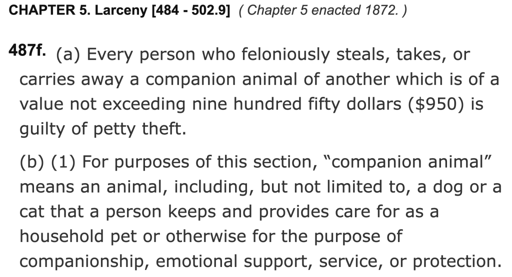 Do not let fraudulent and criminal “animal rescuers” fool you. Under California law, animals are considered personal property. That means that taking them without consent is theft.